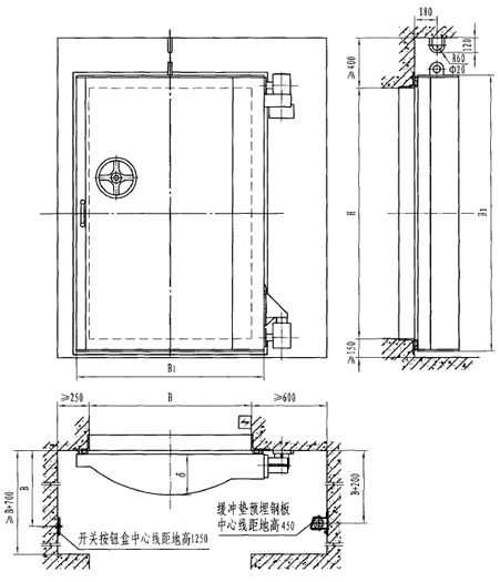 | 型号 | 门孔宽B | 门孔高H | 门扇厚δ | B1 | H1 | 启闭时间(s) |