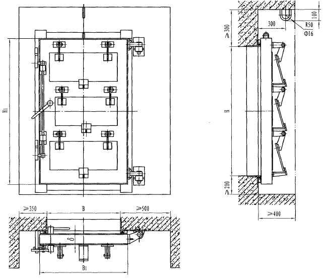 此类悬摆式活门为钢结构,使用、维护方便,适用于进、排风口和排烟口。其中悬摆式防爆波屏蔽活门是在普通悬摆式防爆活门的基础上增加了屏蔽功能,其防电磁脉冲能力为II级。