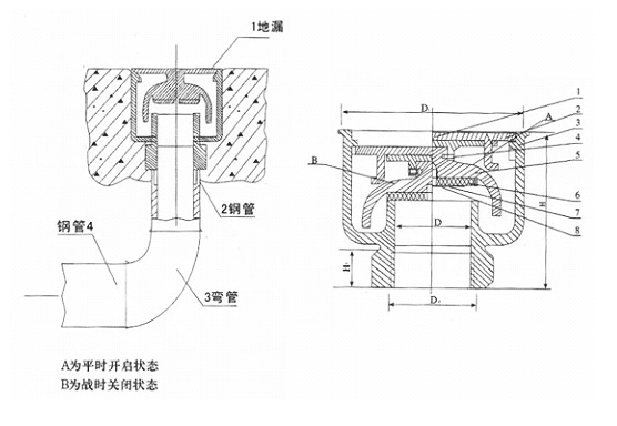 防爆地漏安装于人防工程的排水管道处。平时地漏处于开启状态,保证正常排水;战时将地漏漏盖下降,逆时针旋紧后封闭排水口,密闭时可防止爆炸冲击波及其它有毒气体由管道进入人防工程内部,并可防止污水倒灌,起到安全防护作用。地漏漏体存水深度为30mm,能有效控制臭气外溢。战时该地段染毒需进行清洗时,将地漏打开,进行排水。