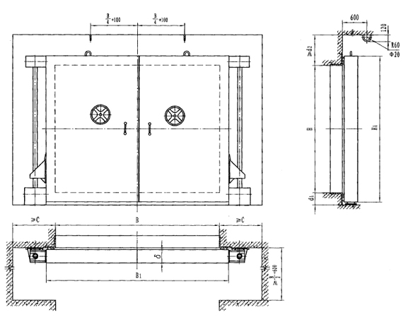 型号 门孔宽B 门孔高H 门扇厚δ B1 H1 C D1 D2