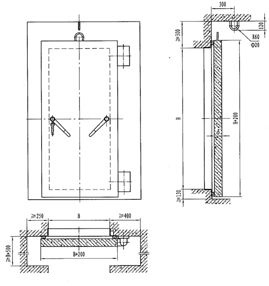 | 型号 | 门孔宽B | 门孔高H | 门扇厚δ |