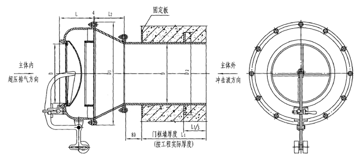 此类活门是具有防爆波性能的自动排气活门。其特点是在通风超压作用下可自动开启排气,当隔绝防护时可锁住,以满足防护、密闭要求。