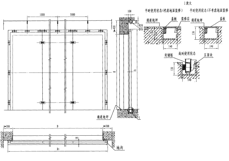 此封堵板可用于封堵平时使用、战时不用的孔口。其特点是平时可以不安装封堵板(但要加工好防在附近的指定位置),战时根据事先设定的转换时限将封堵板进行快速安装,以满足防护、密闭的要求。根据其设置位置的不同可分为防护单元通风口或连通口用双向受力防护密闭封堵板(编号中无“L”)和临空墙防护密闭封堵板两大类。